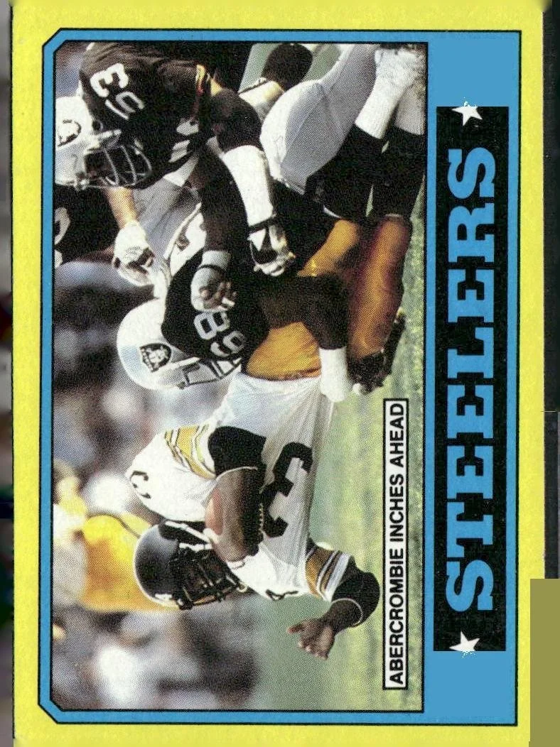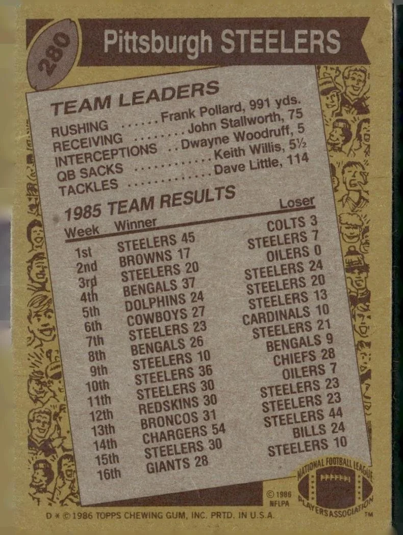 This is a nice example of a 1986 Topps #280 Steelers Team Leaders