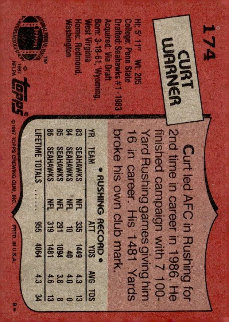 In 1987 Curt Warner played for the Seattle Seahawks.