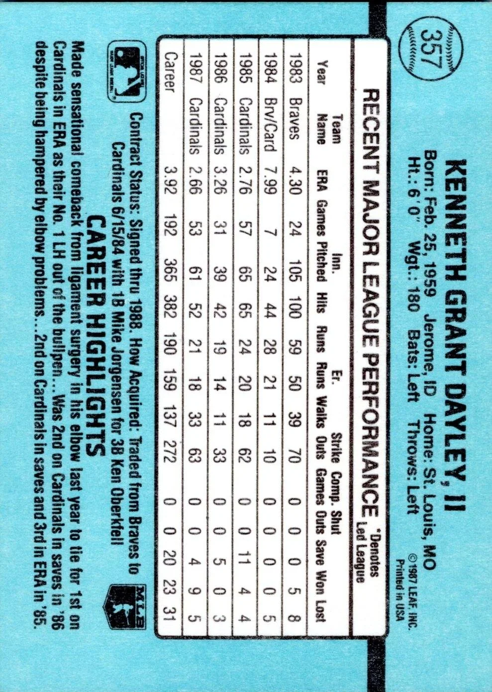 In 1988 Ken Dayley played for the St. Louis Cardinals.