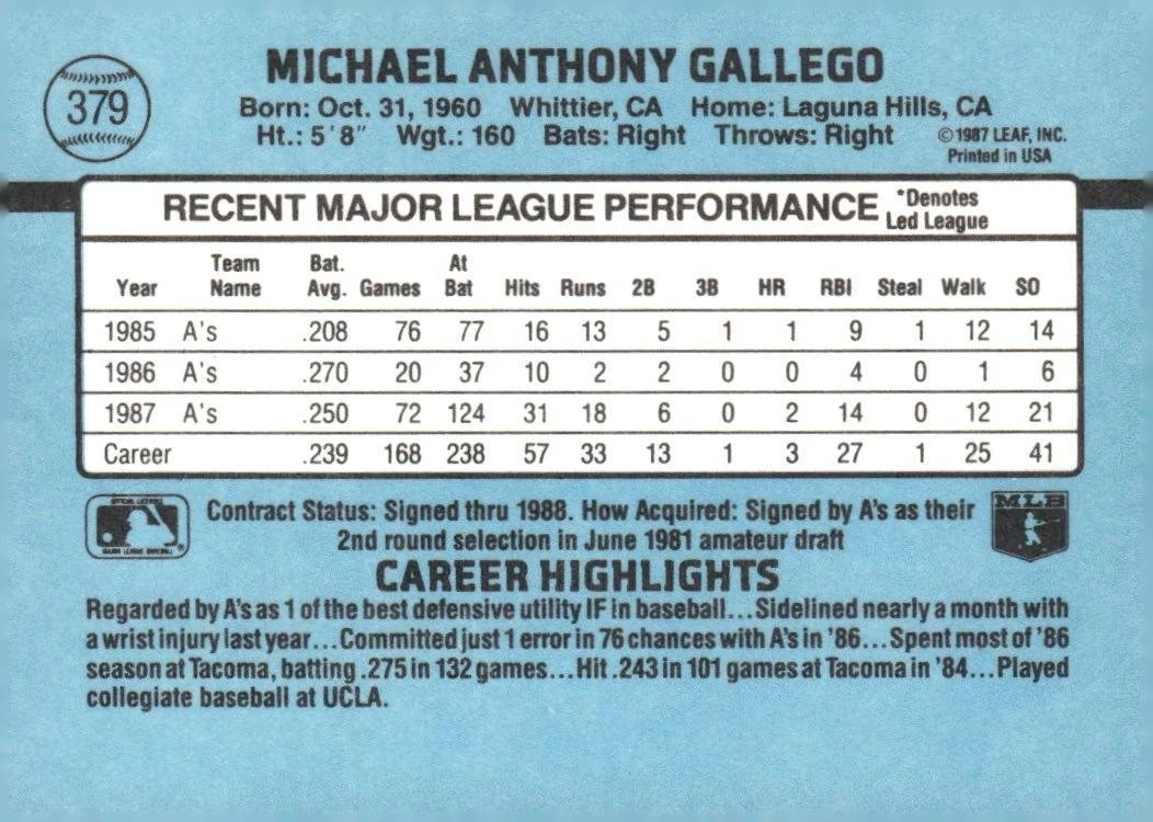 This is a nice example of a 1988 Donruss #379b Mike Gallego