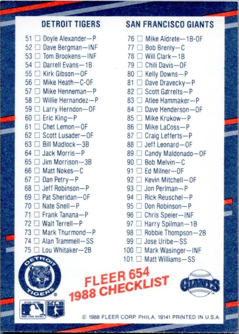 This is a nice example of a 1988 Fleer #654a Checklist: Twins / Cardinals / Tigers / Giants CL, ERR