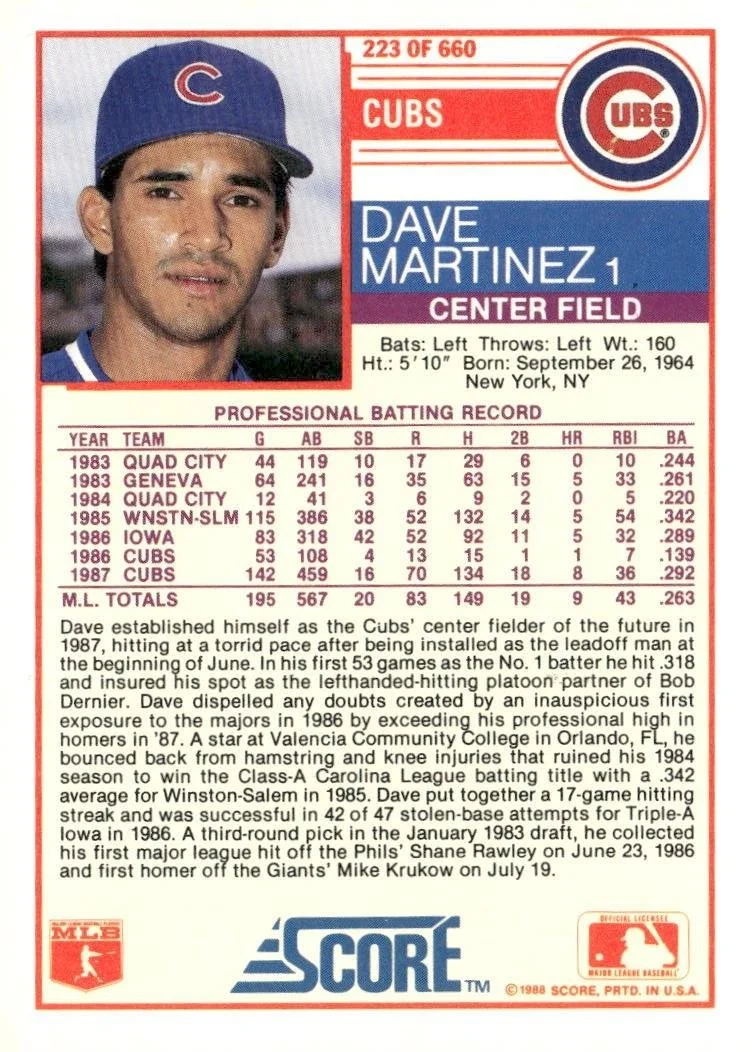This is a nice example of a 1988 Score #223 Dave Martinez