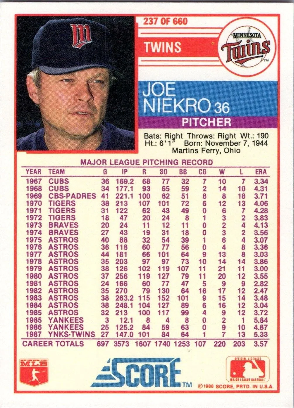 This is a nice example of a 1988 Score #237 Joe Niekro