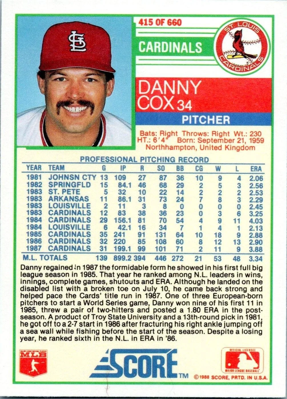 This is a nice example of a 1988 Score #415 Danny Cox