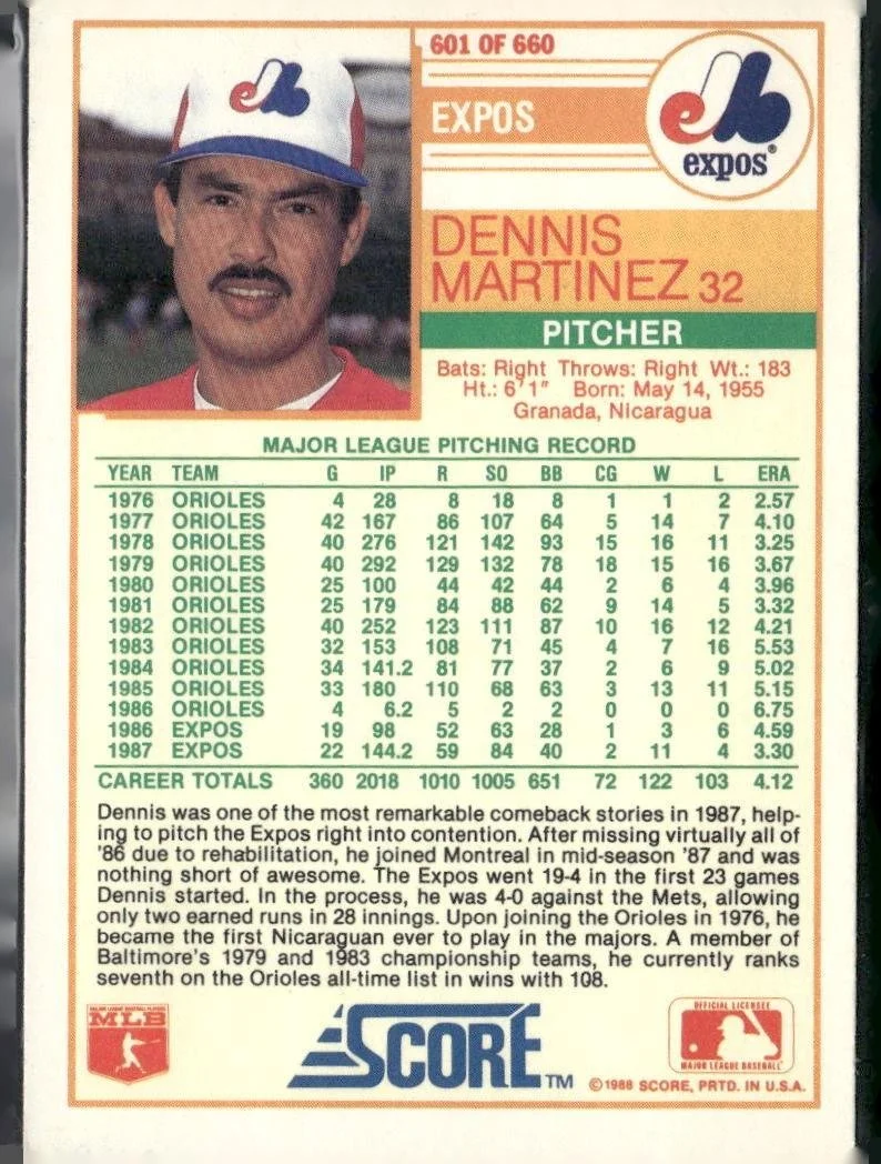 This is a nice example of a 1988 Score #601 Dennis Martinez