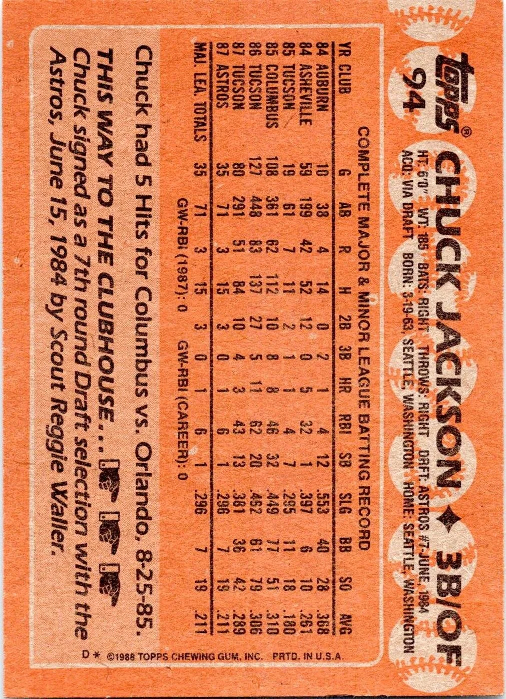 This is a nice example of a 1988 Topps #94 Chuck Jackson