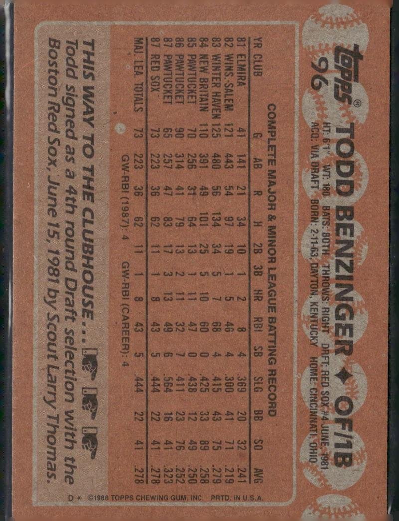 This is a nice example of a 1988 Topps #96 Todd Benzinger