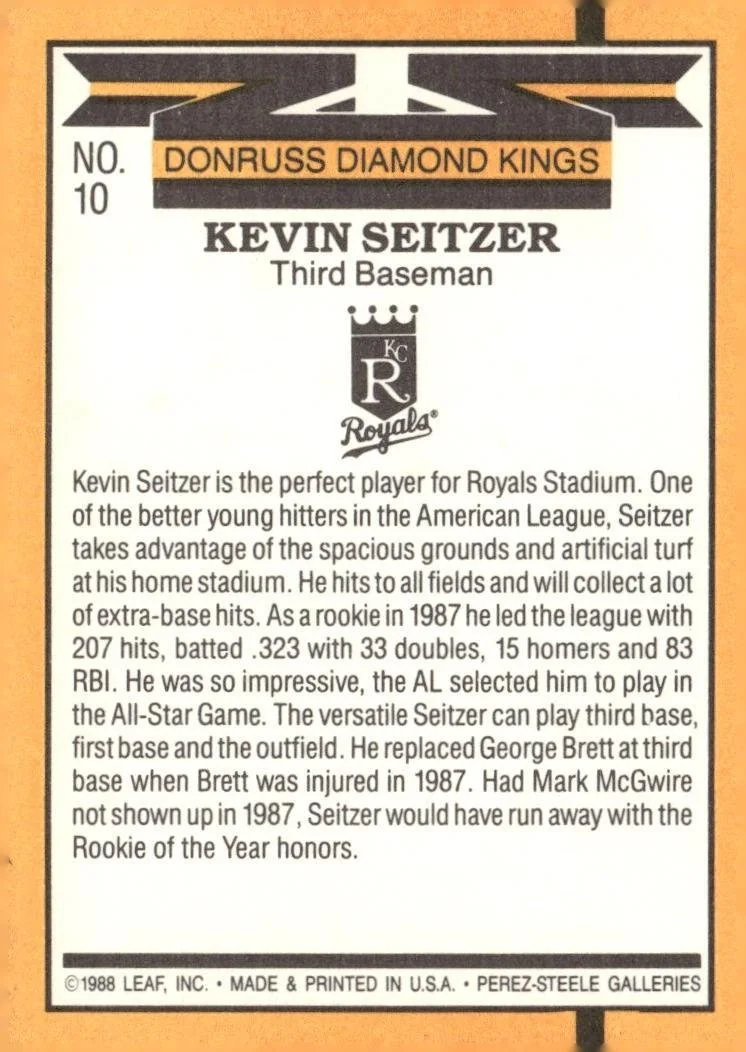 This is a nice example of a 1989 Donruss #10 Kevin Seitzer