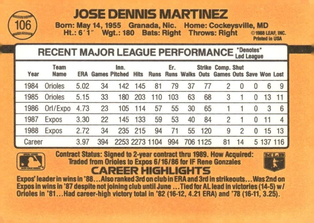 This is a nice example of a 1989 Donruss #106c Dennis Martinez