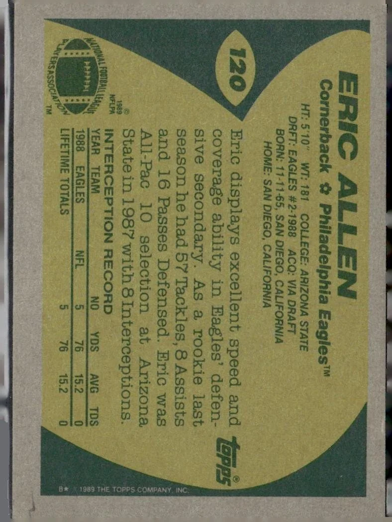 This is a nice example of a 1989 Topps #120 Eric Allen