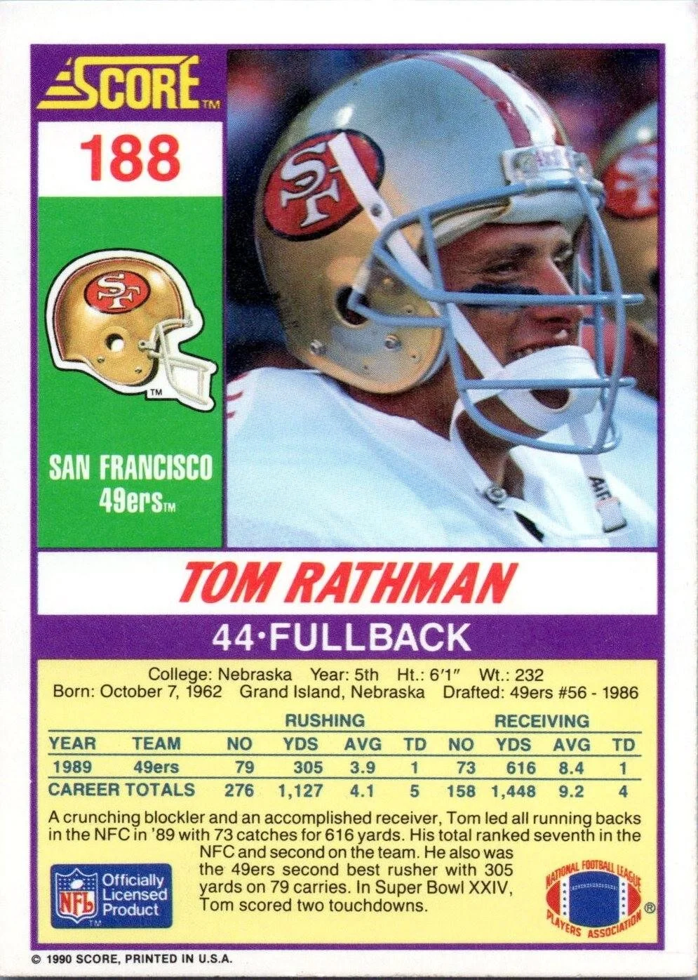 This is a nice example of a 1990 Score #188 Tom Rathman