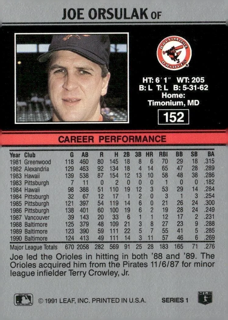 This is a nice example of a 1991 Leaf #152 Joe Orsulak