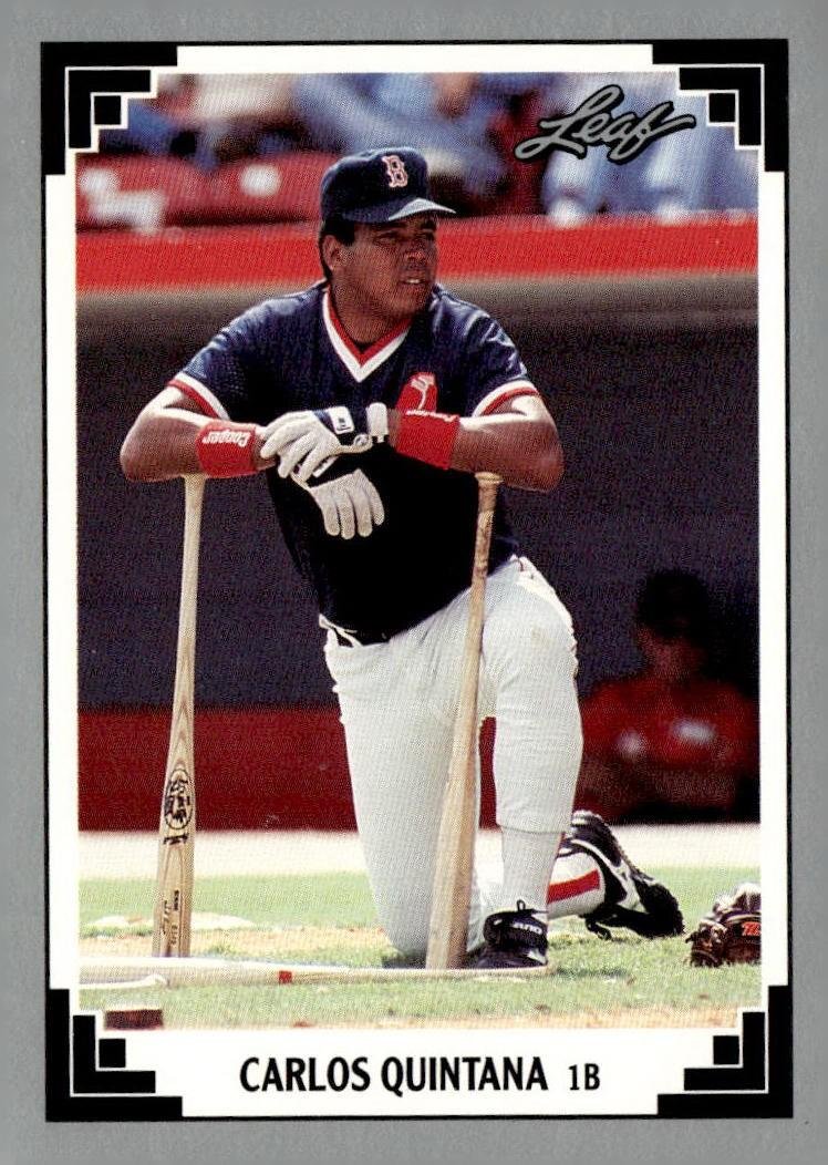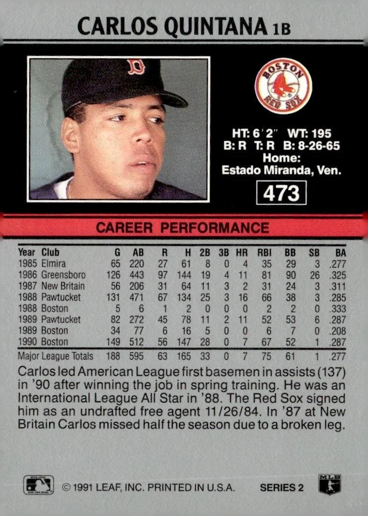 This is a nice example of a 1991 Leaf #473 Carlos Quintana