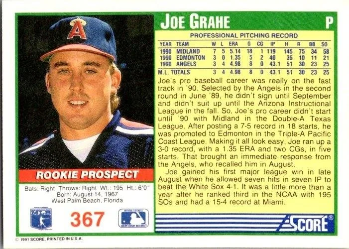 This is a nice example of a 1991 Score #367 Joe Grahe