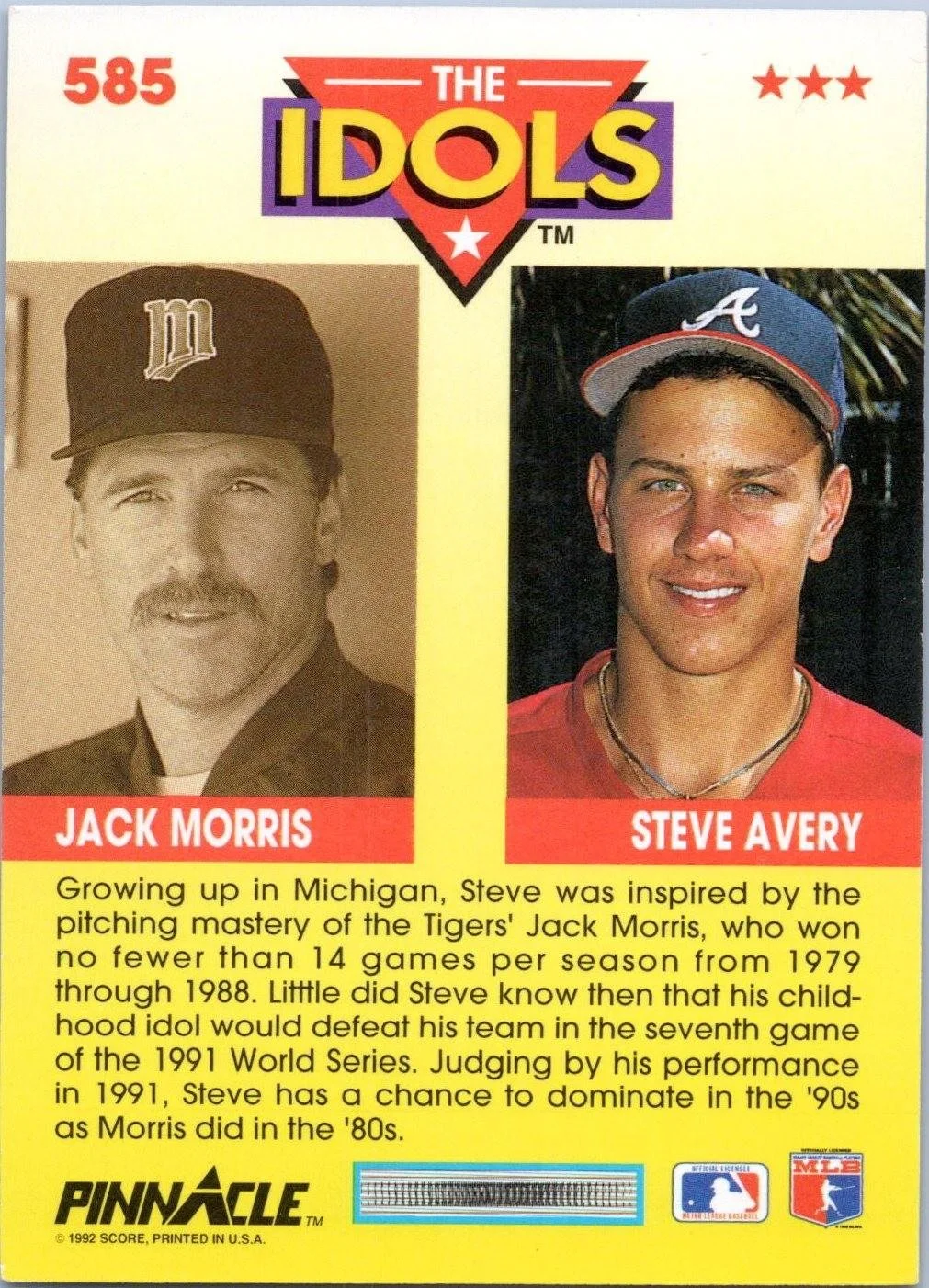 This is a nice example of a 1992 Pinnacle #585 Steve Avery / Jack Morris IDOL
