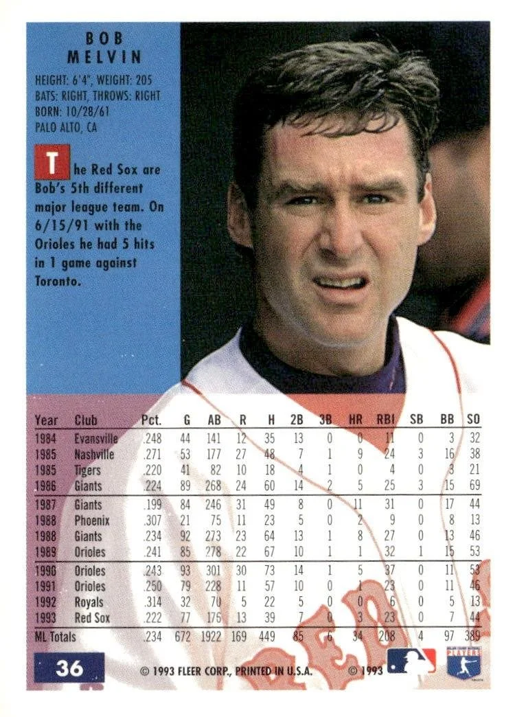 This is a nice example of a 1994 Fleer #36 Bob Melvin