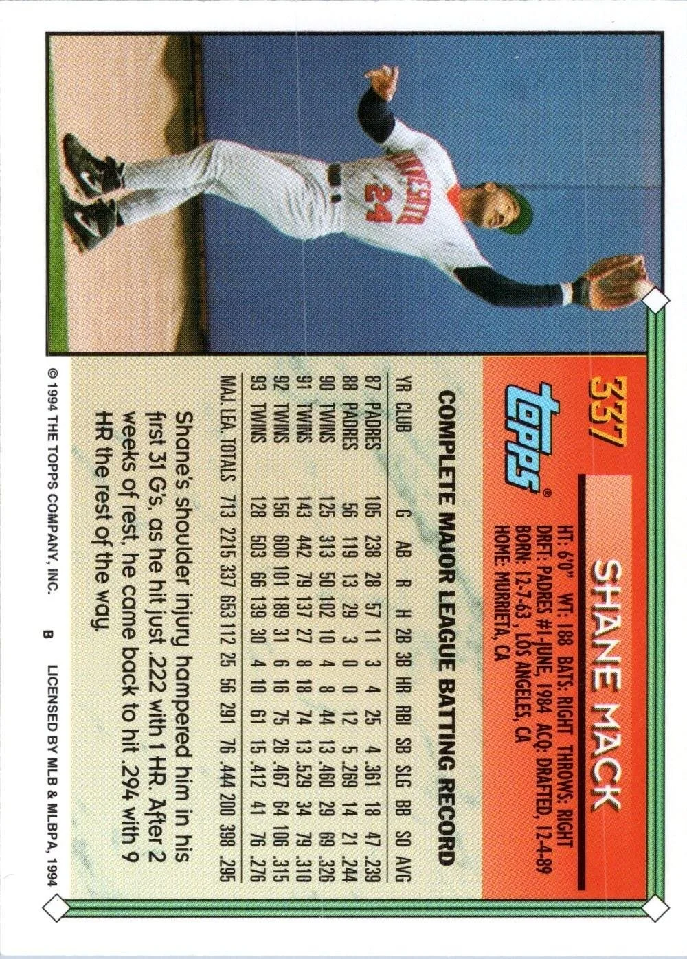 This is a nice example of a 1994 Topps #337b Shane Mack