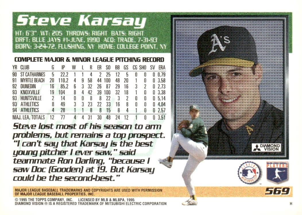 This is a nice example of a 1995 Topps #569 Steve Karsay