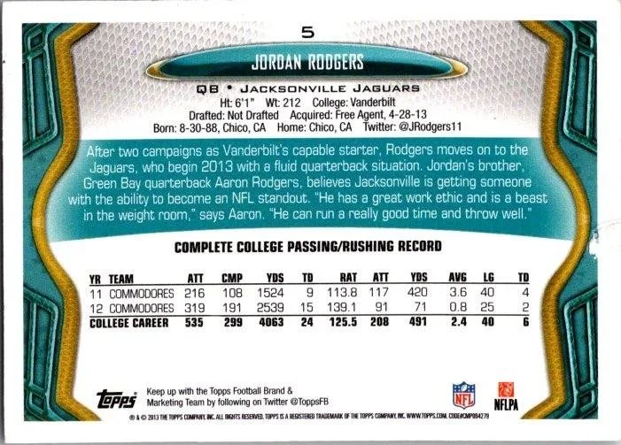 This is a nice example of a 2013 Topps #5 Jordan Rodgers