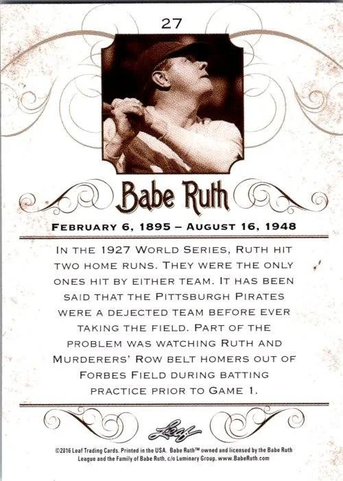 This is a nice example of a 2016 Leaf Babe Ruth Collection #27 Babe Ruth