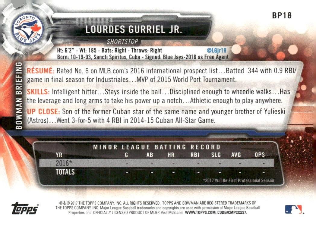 This is a nice example of a 2017 Bowman #BP18 Lourdes Gurriel Jr. Prospects