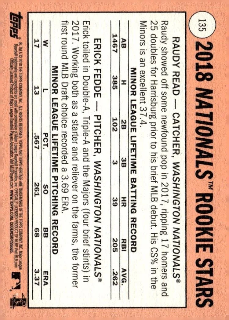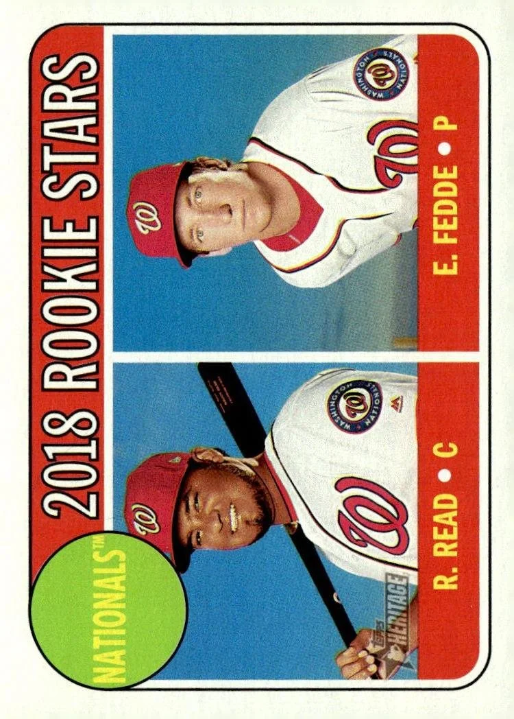 This is a nice example of a 2018 Topps Heritage #135 Nationals 2018 Rookie Stars (Raudy Read / Erick Fedde) RS, RC