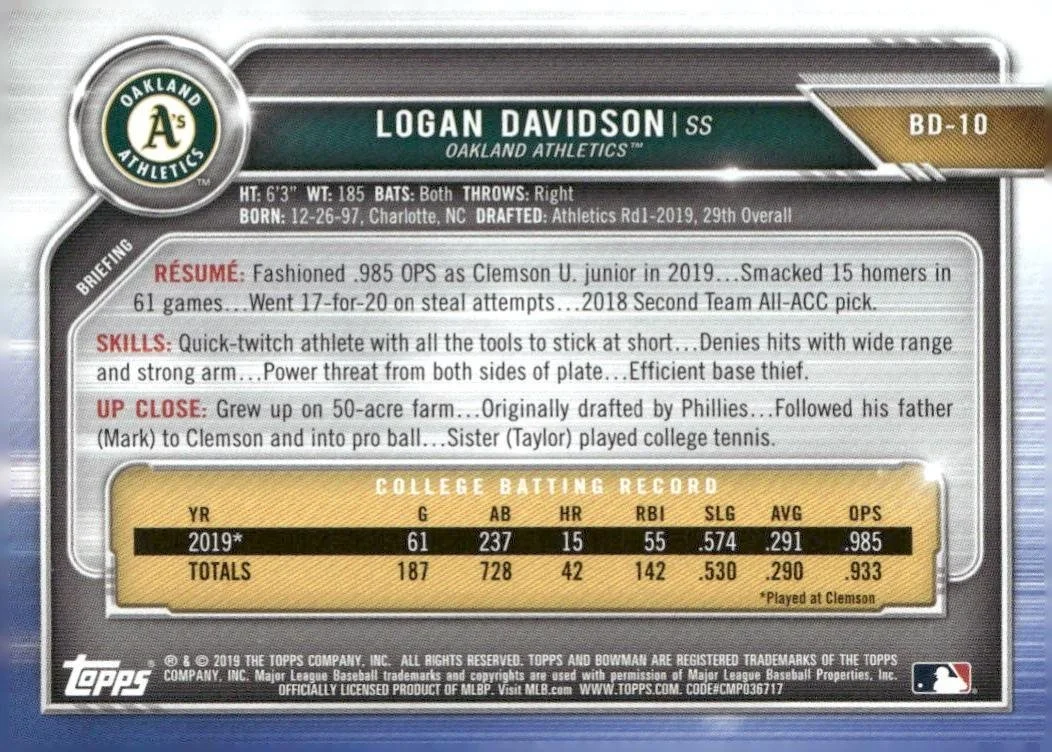 In 2019 Logan Davidson played for the Oakland Athletics.
