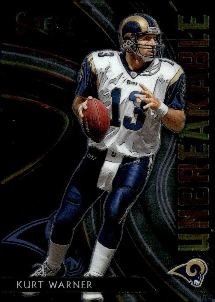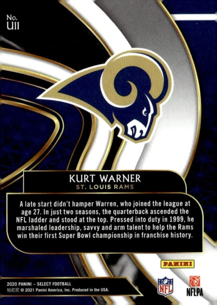 This is a nice example of a 2020 Panini Select #U11 Kurt Warner Unbreakable