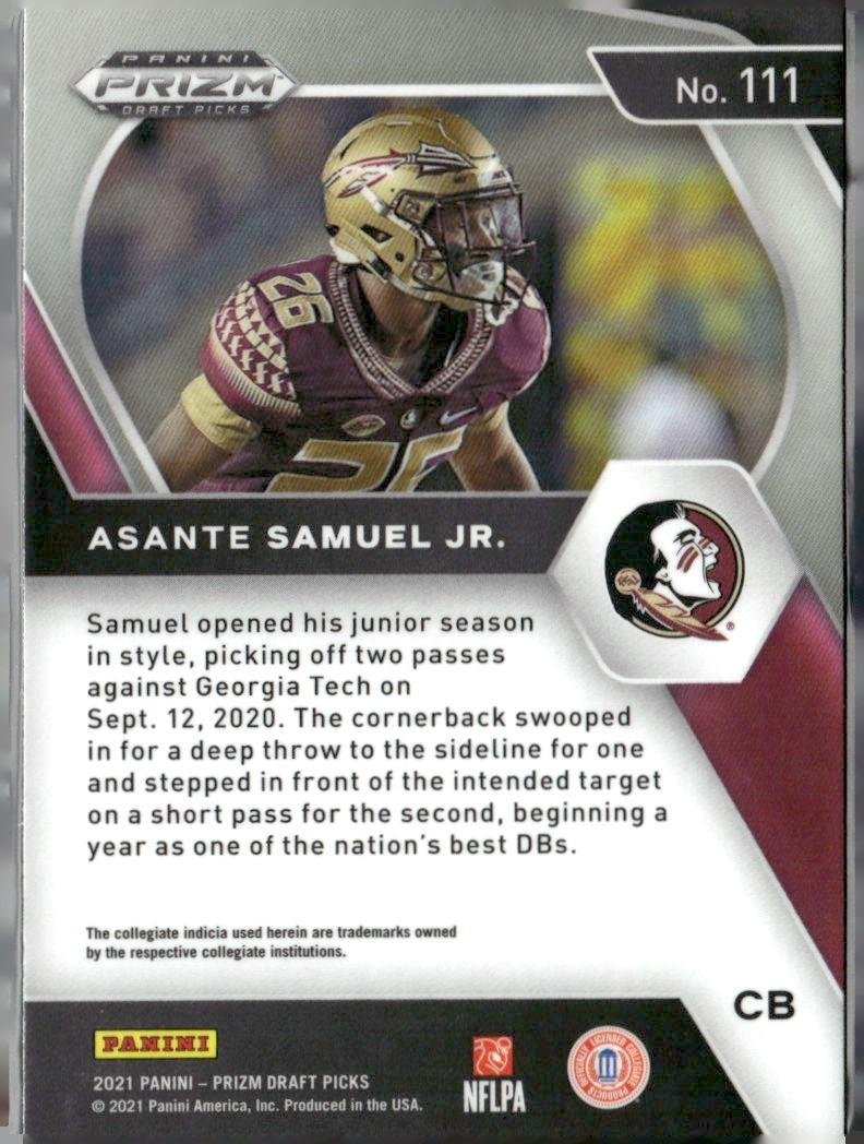 This is a nice example of a 2021 Panini Prizm Draft Picks Collegiate #111 Asante Samuel Jr.