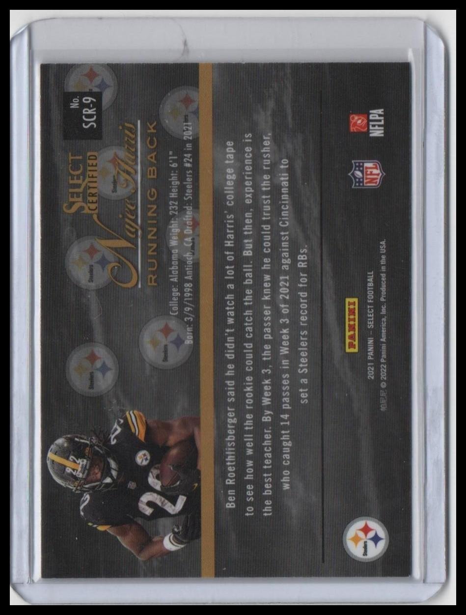 Up for sale is the 2021 Panini Select Football #SCR-9 Najee Harris rookie card from the Select Certified Rookies subset. This card features the dynamic Steelers running back in a bold foil design, making it a standout piece for collectors and fans alike.