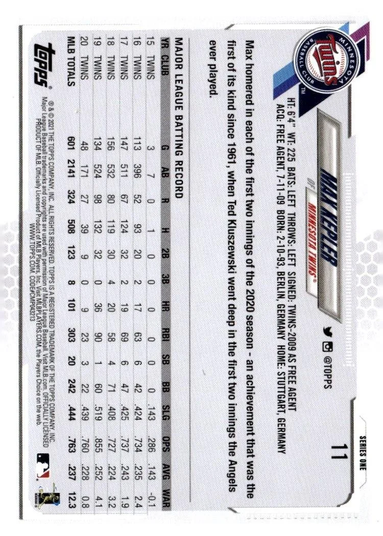 This is a nice example of a 2021 Topps #11 Max Kepler