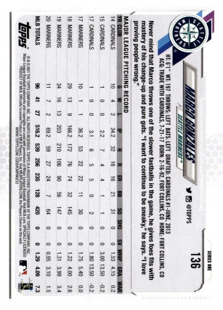 This is a nice example of a 2021 Topps #136 Marco Gonzales