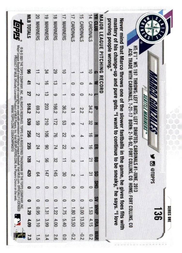 This is a nice example of a 2021 Topps #136 Marco Gonzales