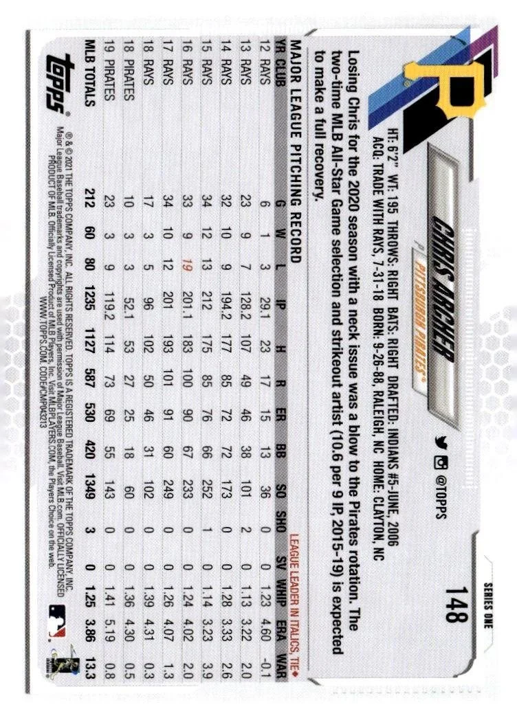 This is a nice example of a 2021 Topps #148 Chris Archer