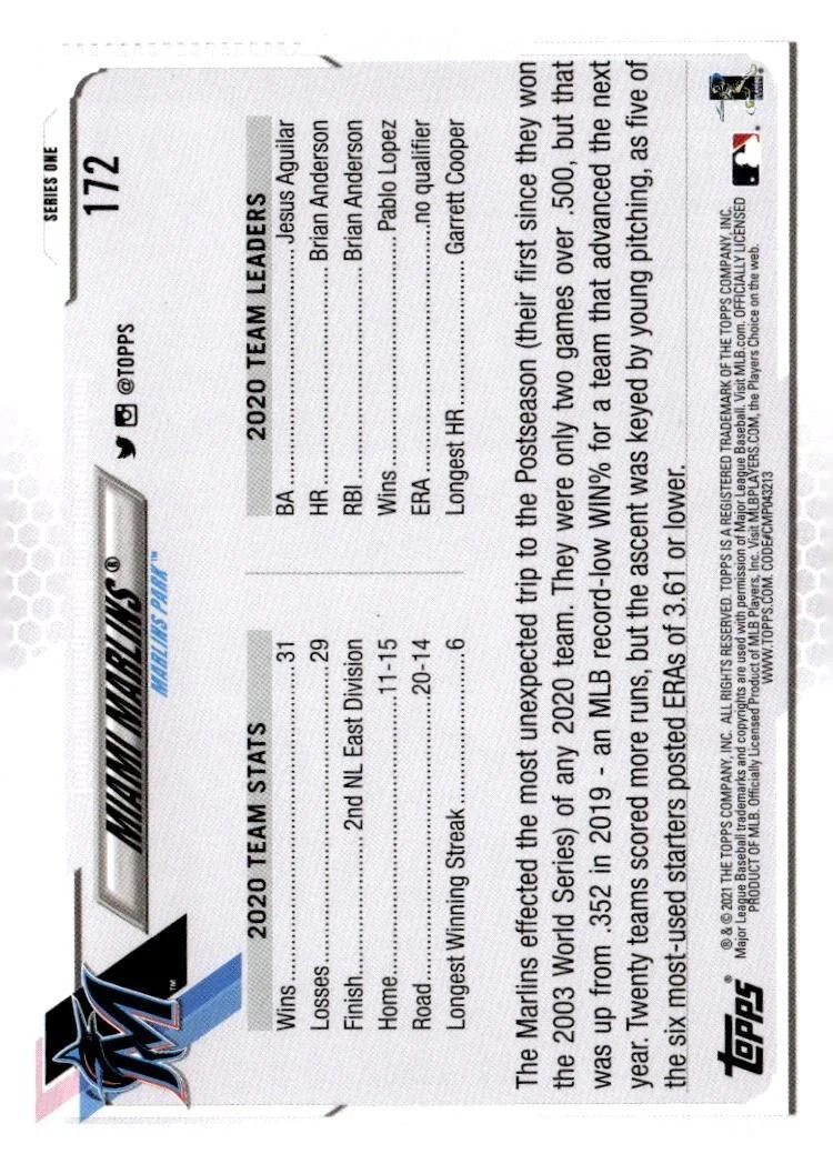 This is a nice example of a 2021 Topps #172 Miami Marlins