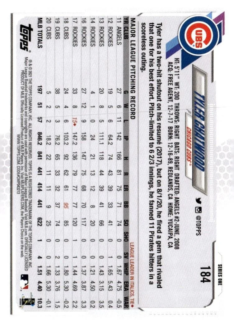 This is a nice example of a 2021 Topps #184 Tyler Chatwood