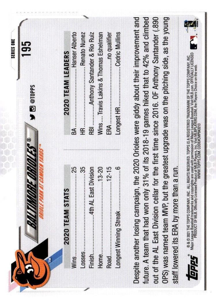 This is a nice example of a 2021 Topps #195 Baltimore Orioles