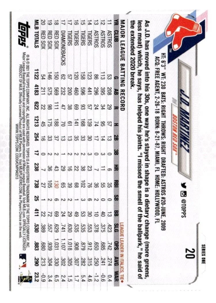 This is a nice example of a 2021 Topps #20 J.D. Martinez