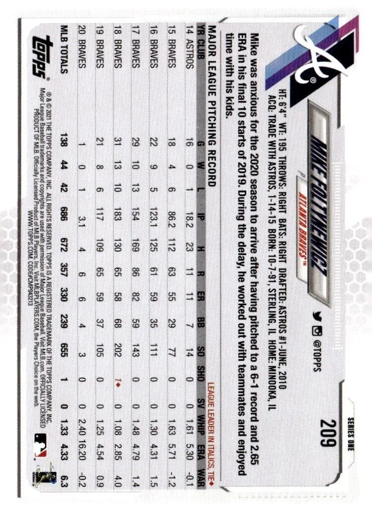 This is a nice example of a 2021 Topps #209 Mike Foltynewicz