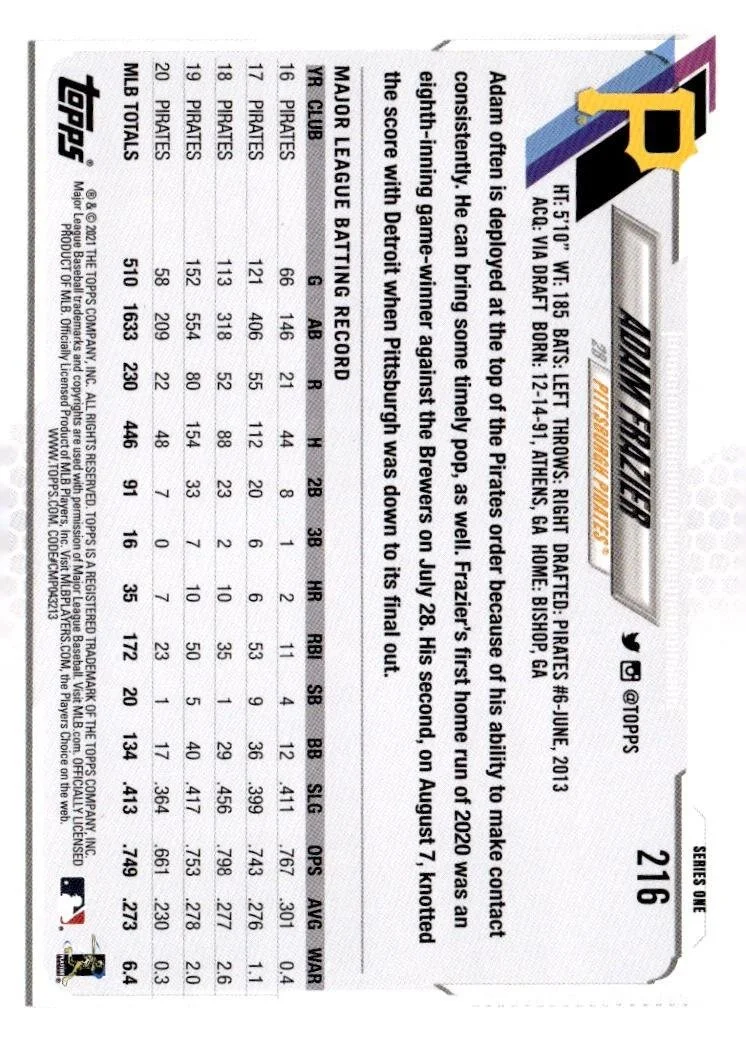 This is a nice example of a 2021 Topps #216 Adam Frazier