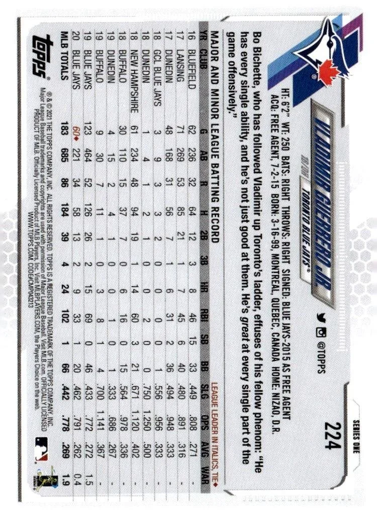 This is a nice example of a 2021 Topps #224 Vladimir Guerrero Jr.