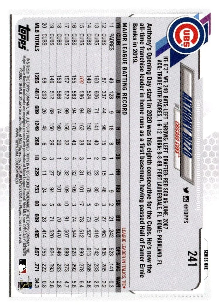 This is a nice example of a 2021 Topps #241 Anthony Rizzo