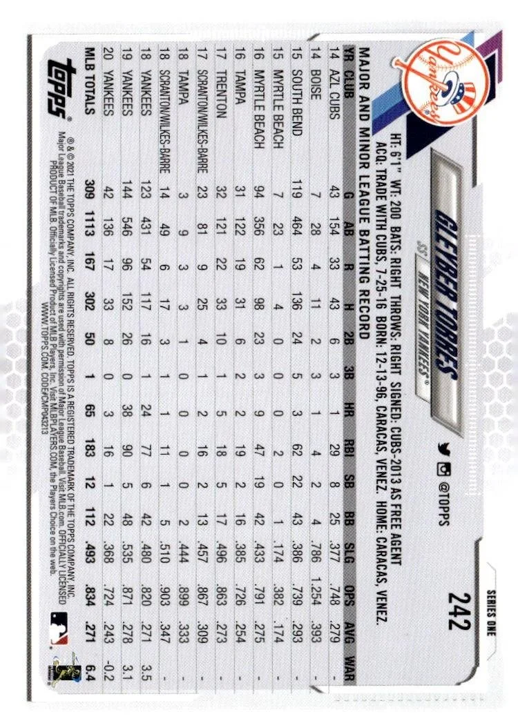 This is a nice example of a 2021 Topps #242a Gleyber Torres