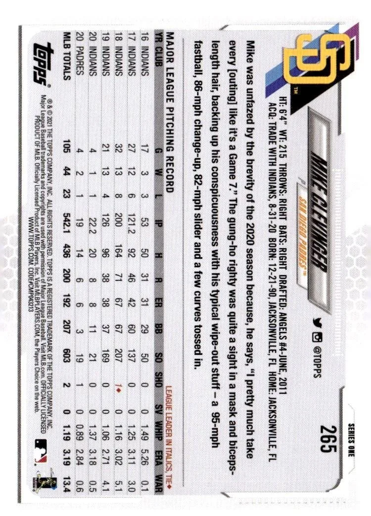 This is a nice example of a 2021 Topps #265 Mike Clevinger