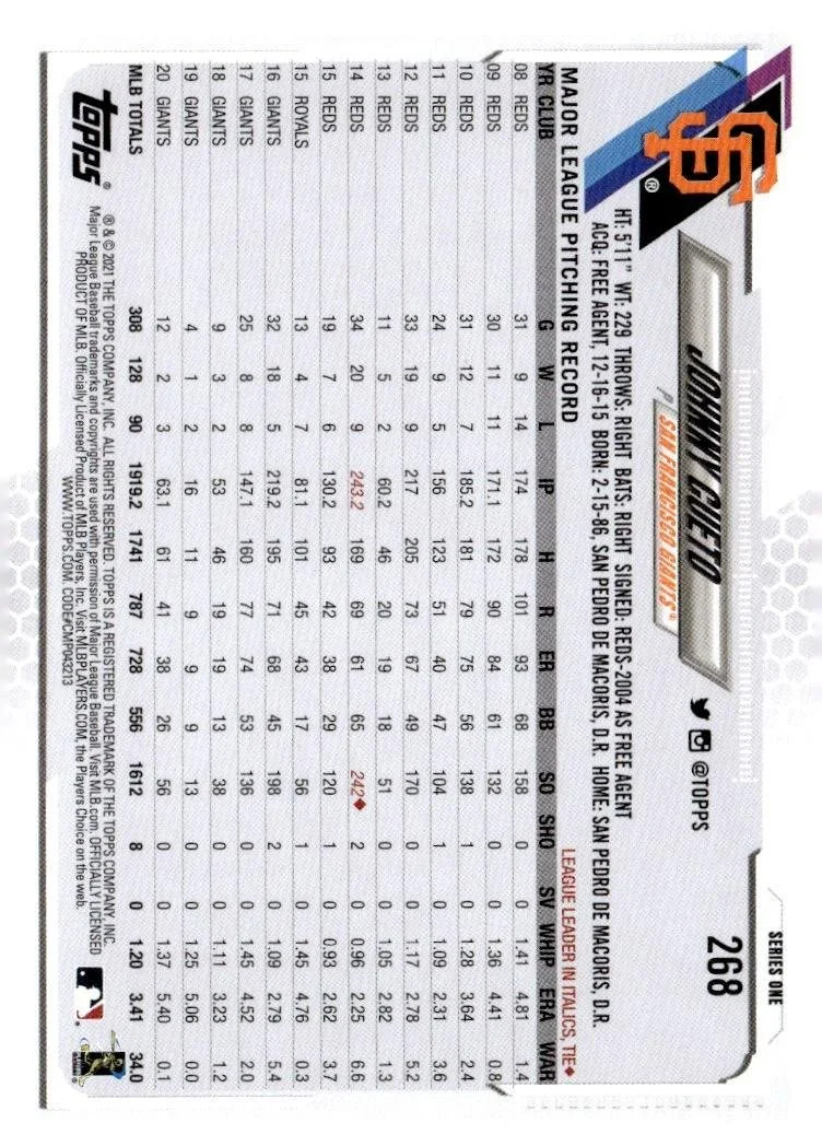 This is a nice example of a 2021 Topps #268 Johnny Cueto