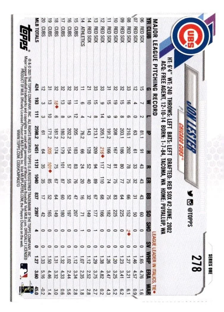 This is a nice example of a 2021 Topps #278 Jon Lester