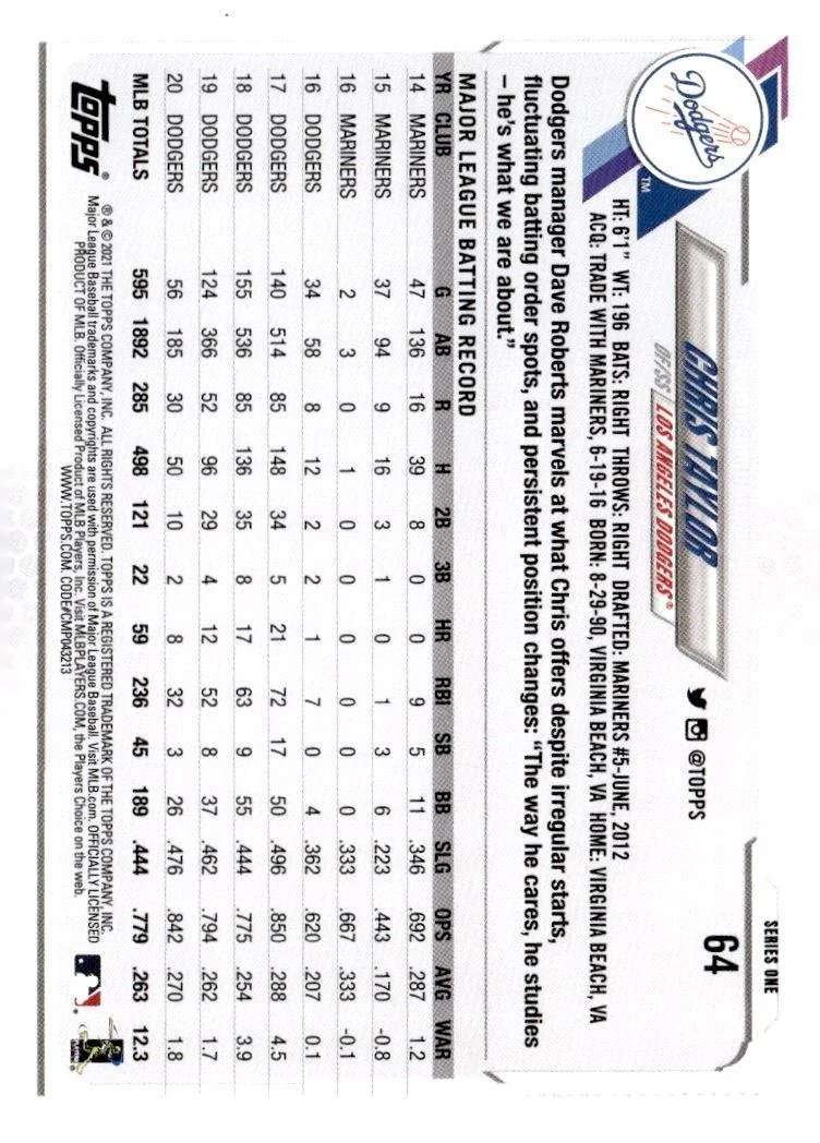 This is a nice example of a 2021 Topps #64 Chris Taylor