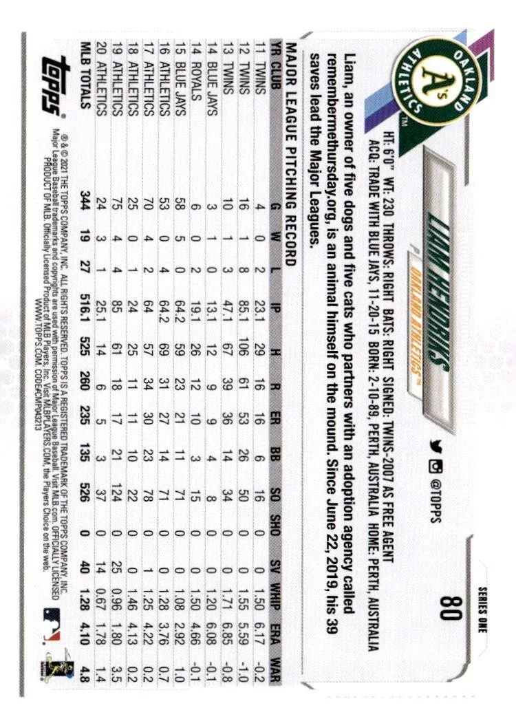 This is a nice example of a 2021 Topps #80 Liam Hendriks