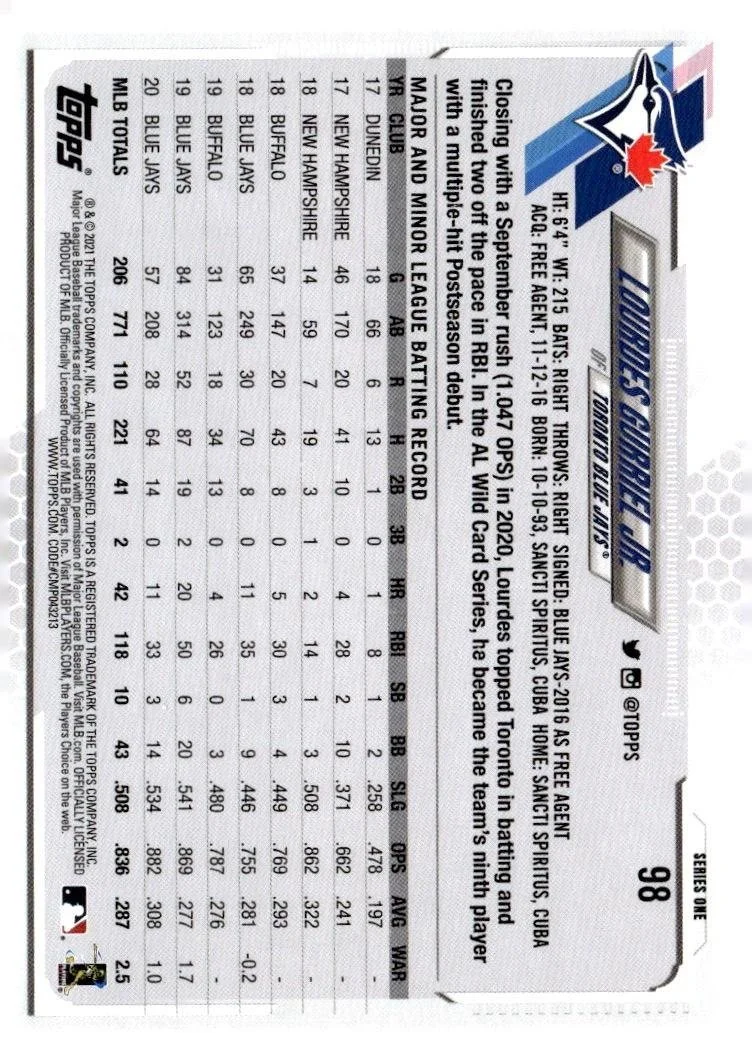 This is a nice example of a 2021 Topps #98 Lourdes Gurriel Jr.