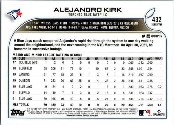 This is a nice example of a 2022 Topps #432 Alejandro Kirk